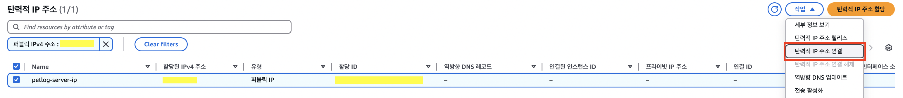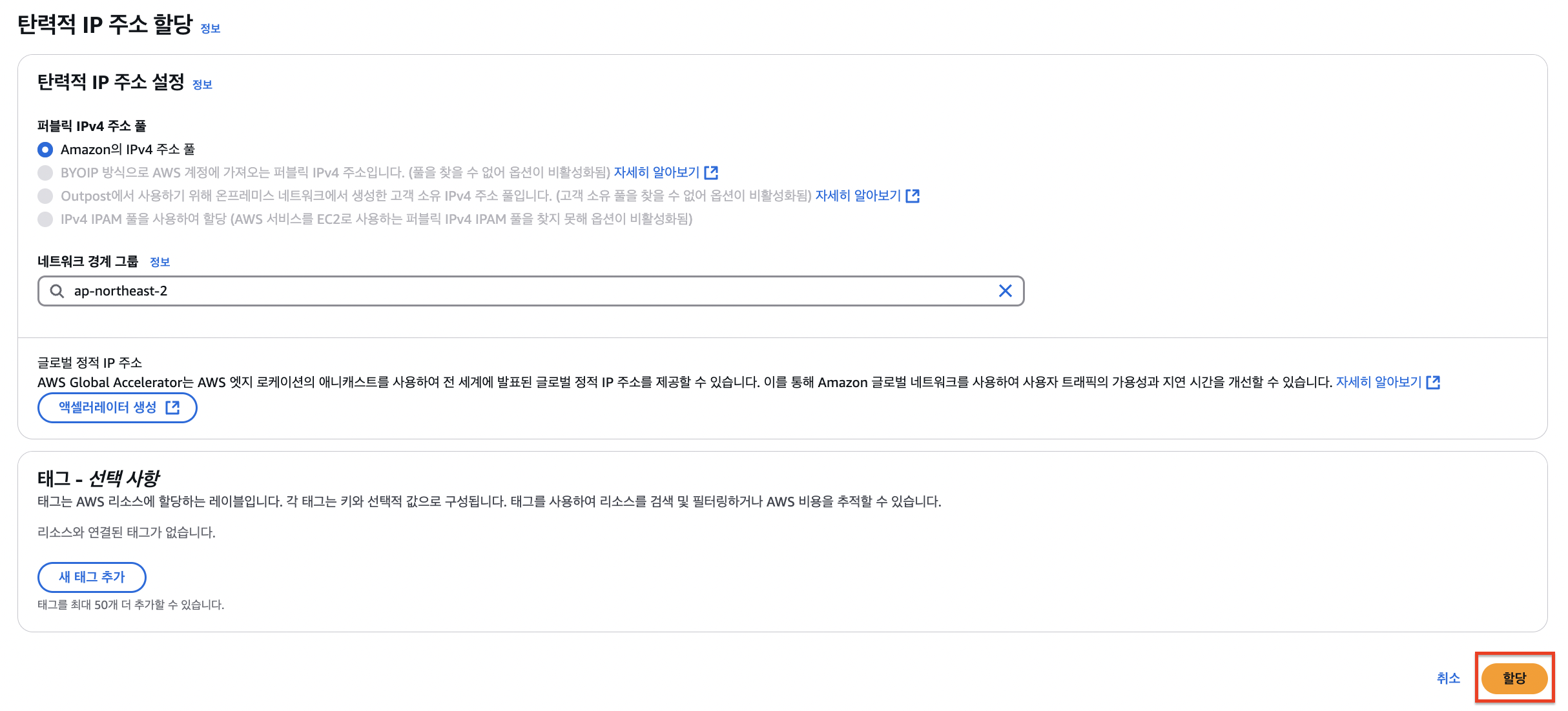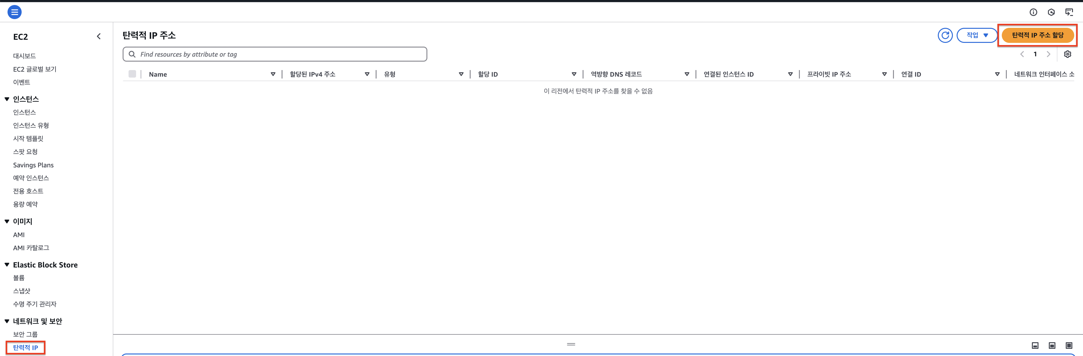 EC2 > 탄력적 IP 카테고리에 들어가서 탄력적 IP 주소 할당을 선택