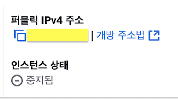 탄력적 IP를 적용한 인스턴스의 상태. 중지해도 IP주소가 그대로 남아있다.