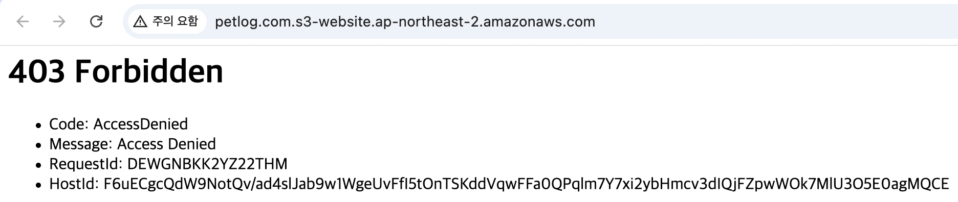 우리는 퍼블릭 엑세스를 모두 차단해놓기도 했고 아직 S3의 정책이 퍼블릭 접근을 막고 있어 403에러가 나오는 것이다.