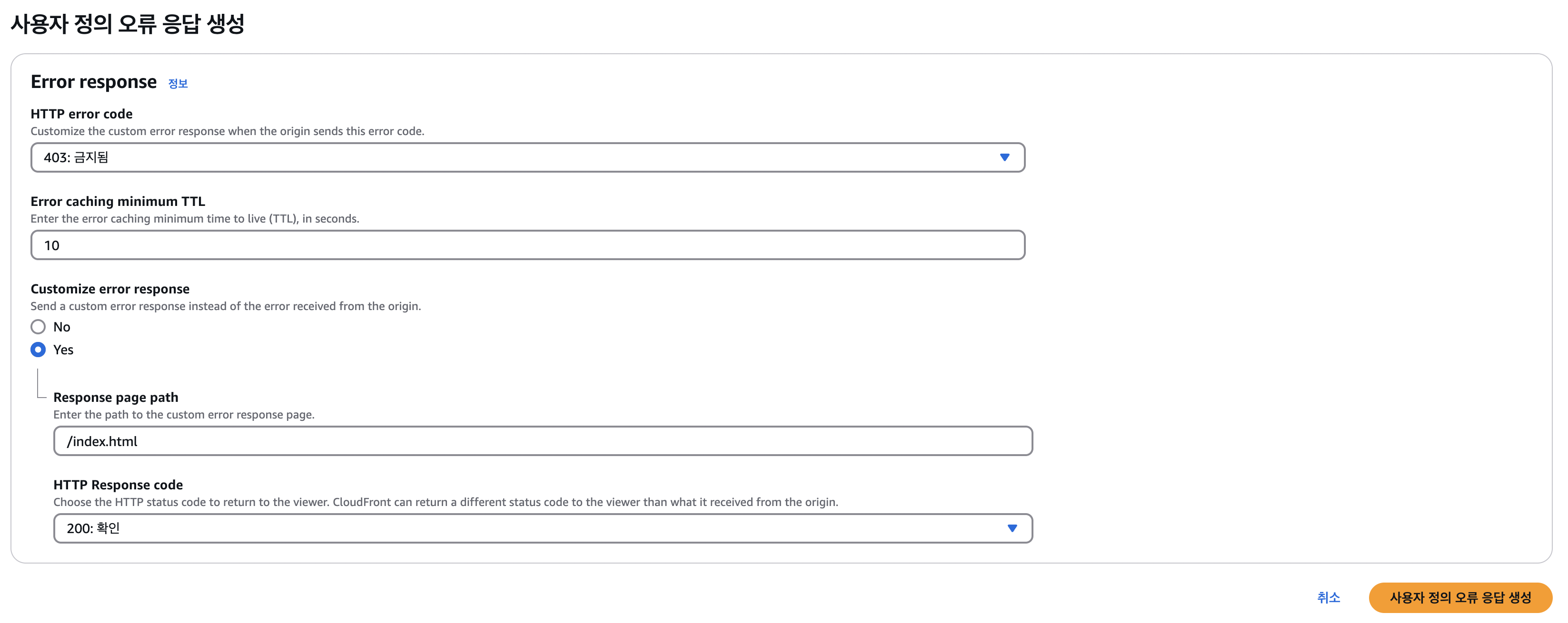 다 설정해준 후 사용자 정의 오류 응답 생성을 선택한다.