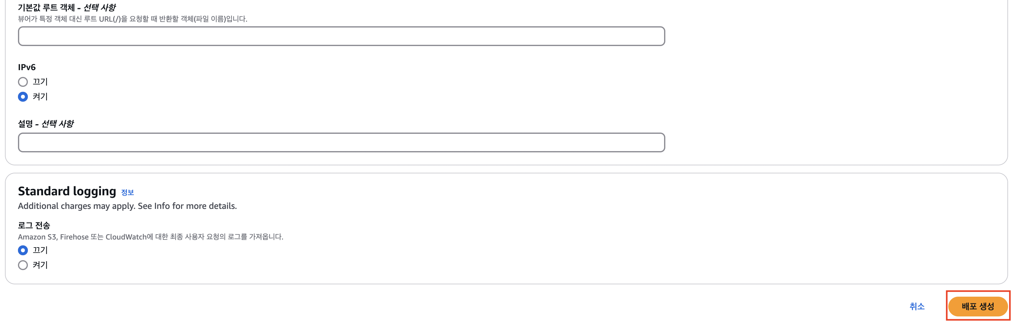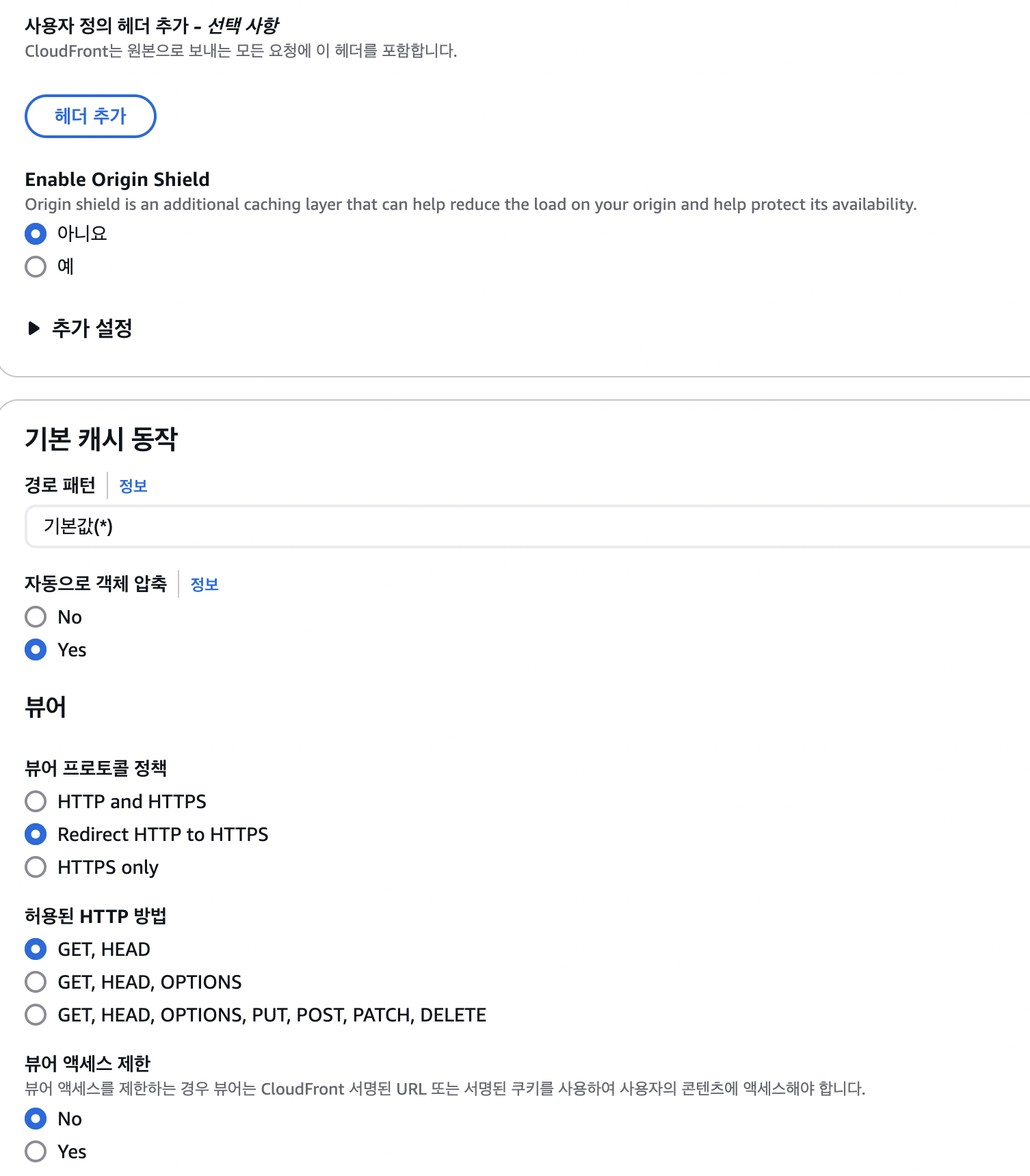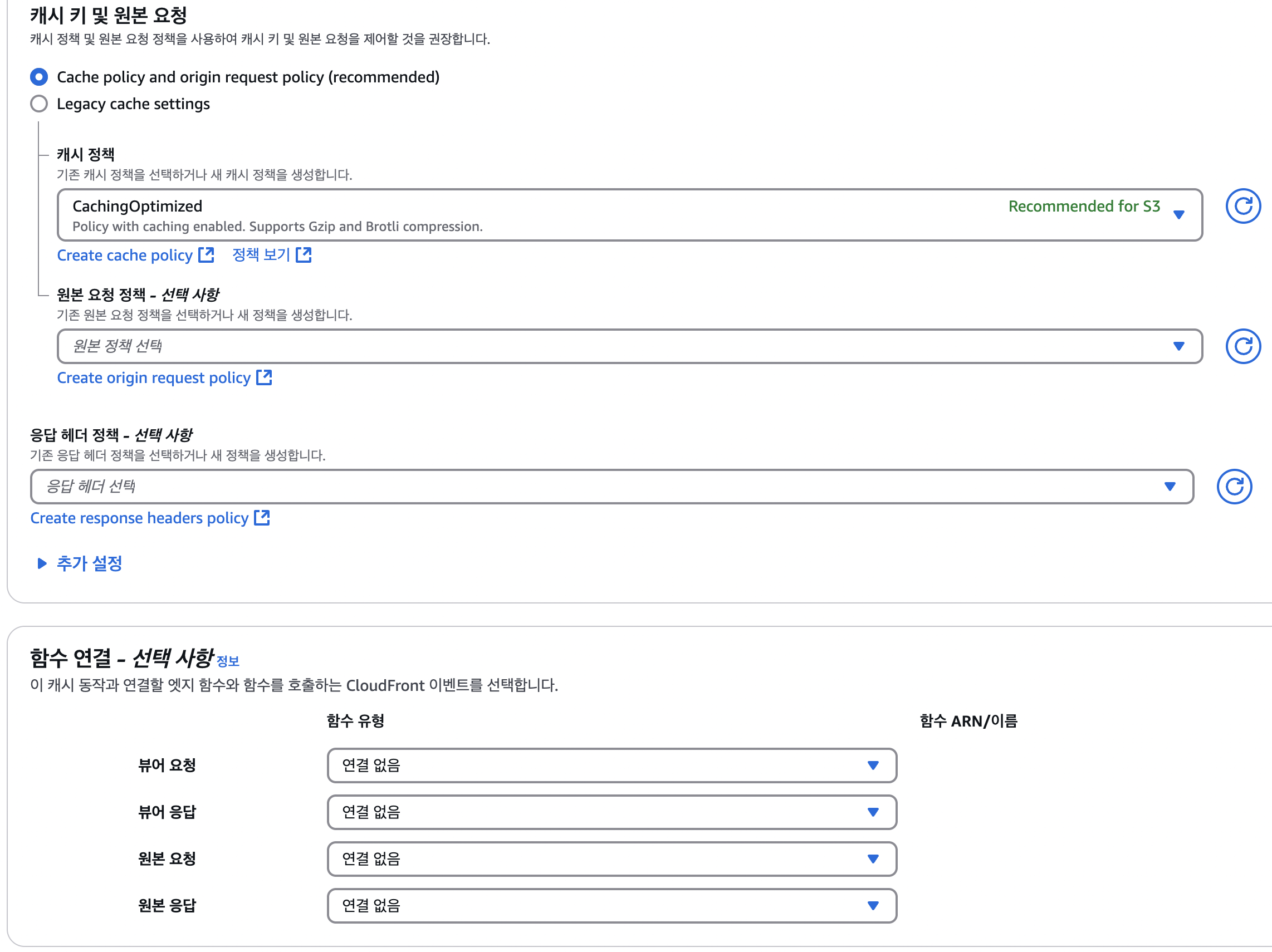 캐싱에 대해선 기본값을 사용했다. CloudFront의 경우 Default로 24시간의 캐싱 기간을 갖기 때문에 파일이 변경되었을 경우 캐시 무효화를 실행해주어야 변경된 객체가 적용된다.