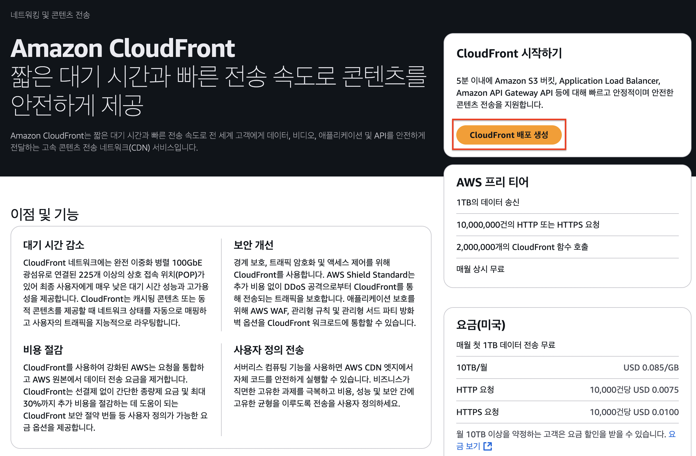 AWS에서 CloudFront 선택해준 뒤 바로 보이는 CloudFront배포 생성을 선택한다.