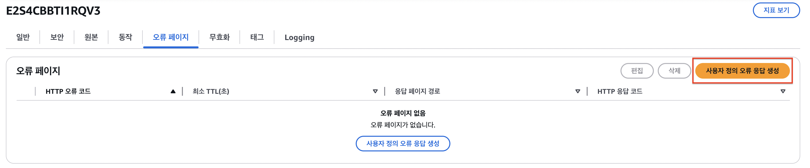 생성된 CloudFront에 들어가면 오류페이지가 있다. 아까보았듯이 기본적으로 퍼블릭 엑세스가 거부되어있으므로 AccessDenied파일이 뜬다. 그래서 이 403에러에 대한 응답을 직접 설정해줘야한다.