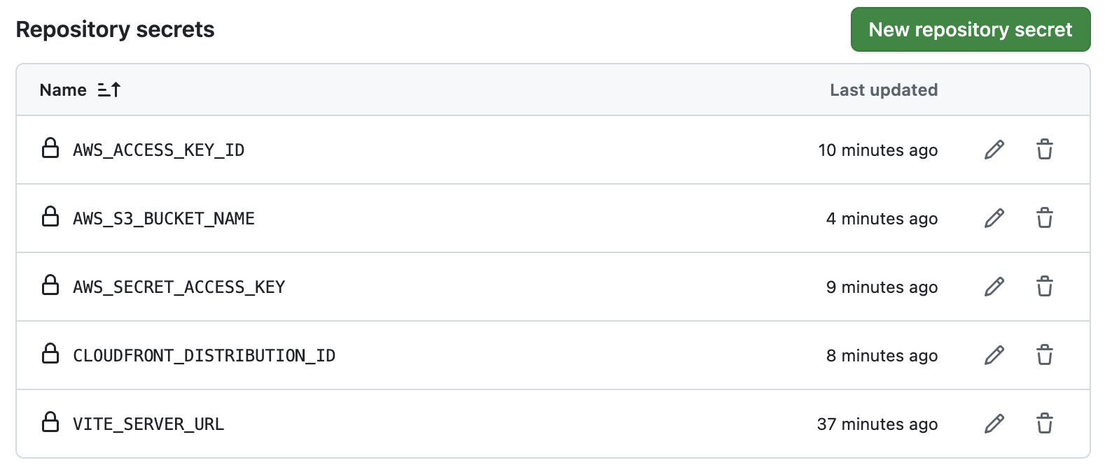 다시 Actions secrets로 돌아와와서 발급해준 Access Key를 비롯한 환경변수들을 입력해준다.