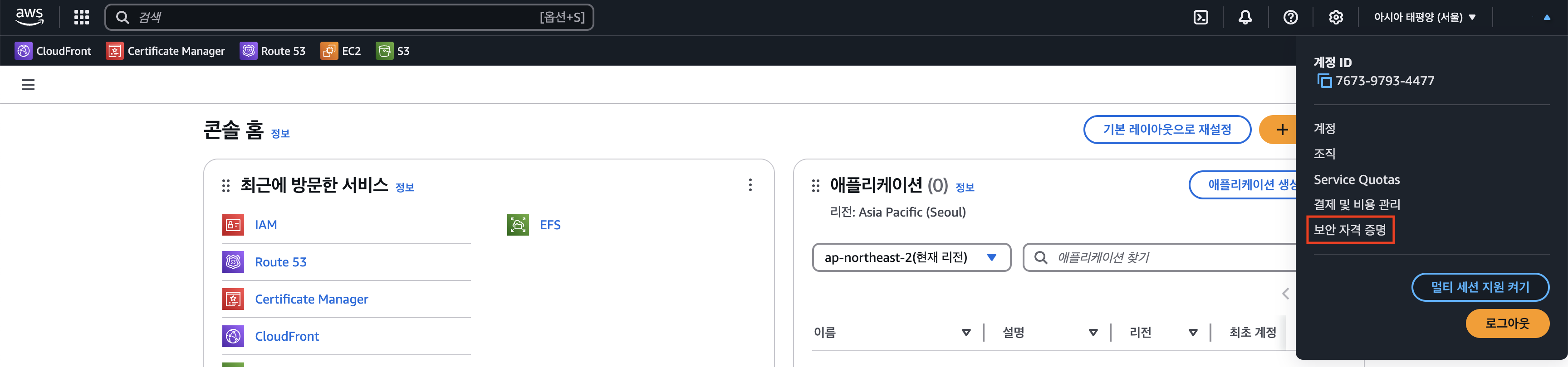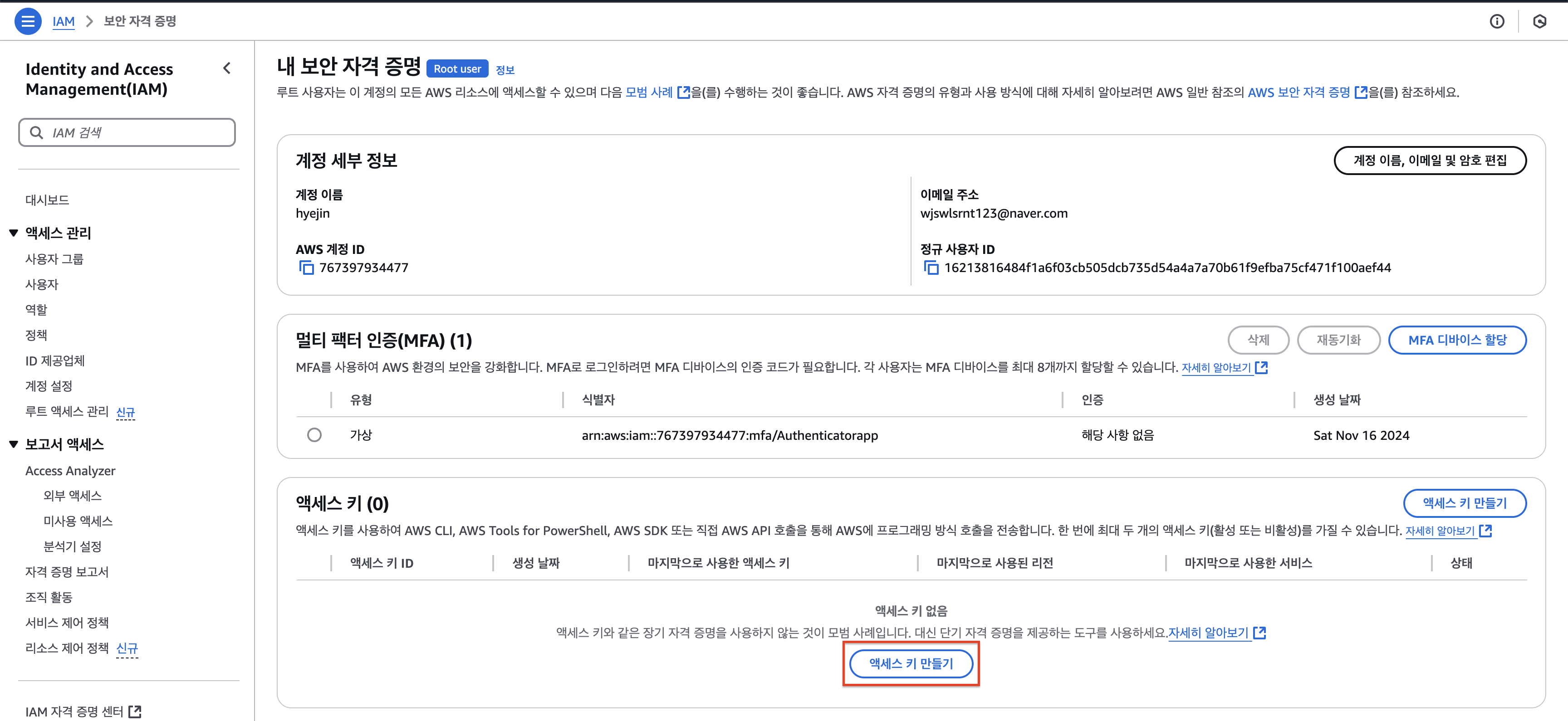 AWS > 보안 자격 증명 선택
