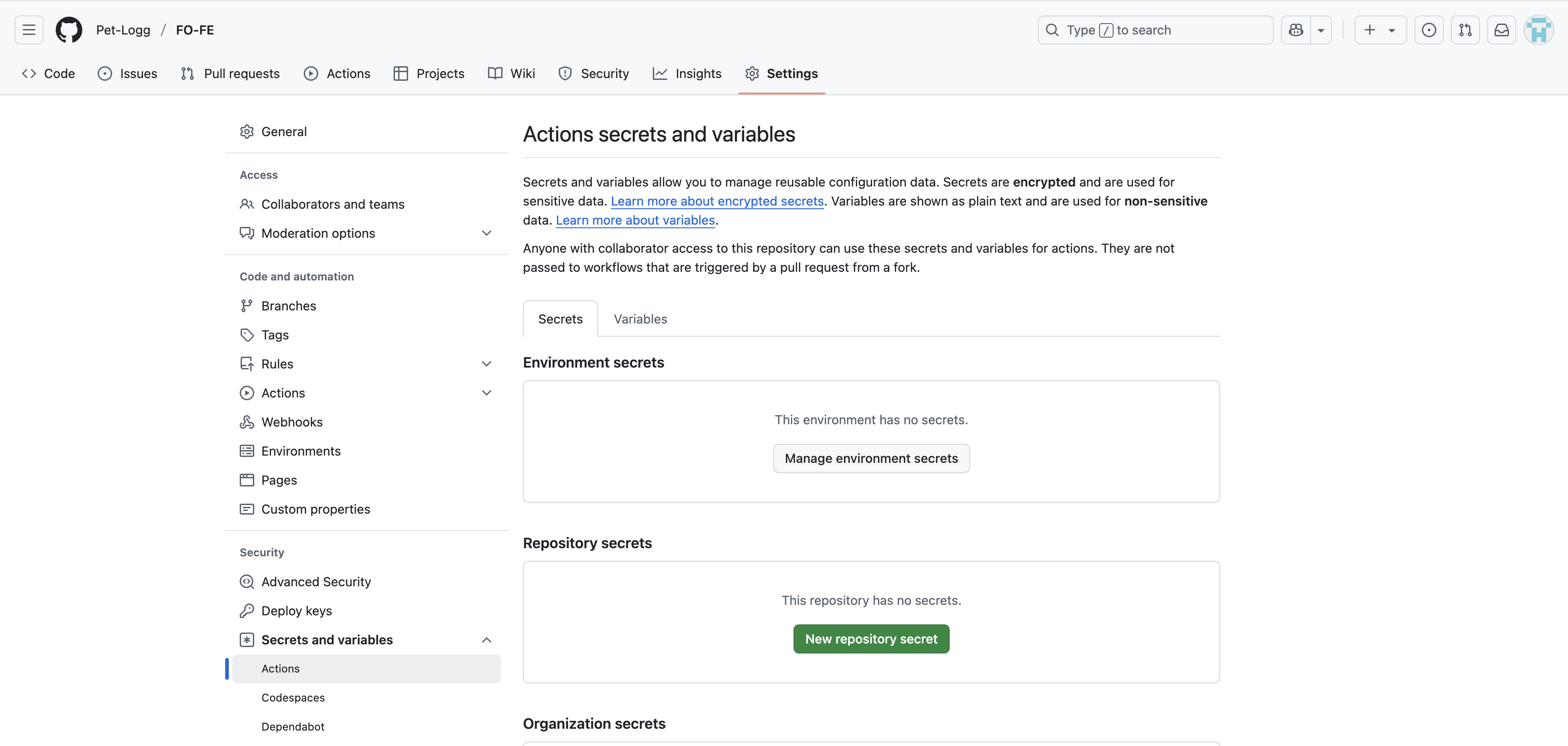 프로젝트 레포지토리의 Settings > Secrets and variables > Actions
