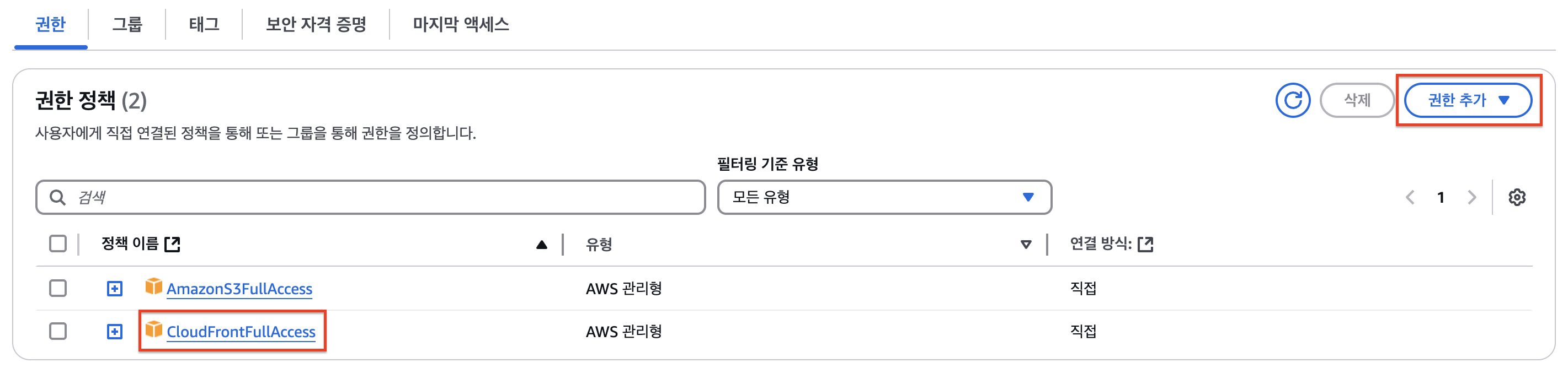 이후 만들어진 액세스키에 CloudeFront 권한을 추가해주면 된다.