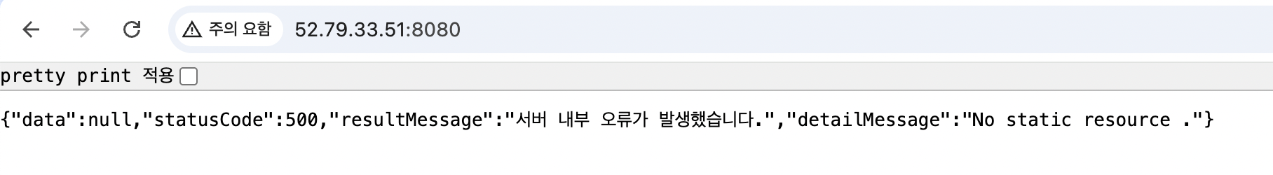 EC2 인스턴스의 왼쪽 하단에 있는 PublicIPs 주소:포트번호 로 들어가면 이렇게 배포가 잘되어 접속이 가능하다.