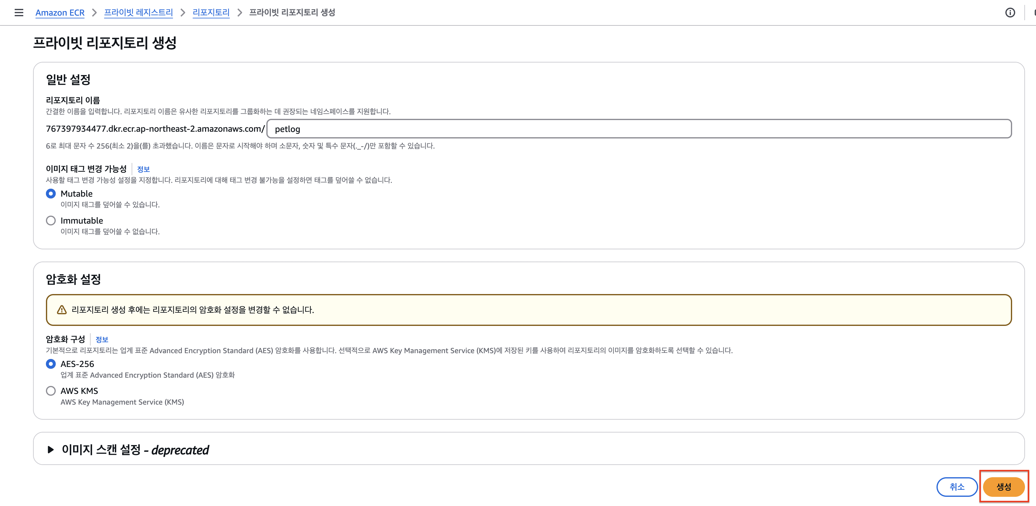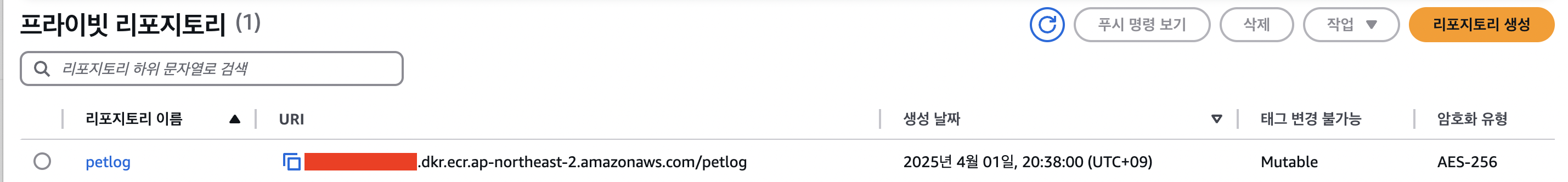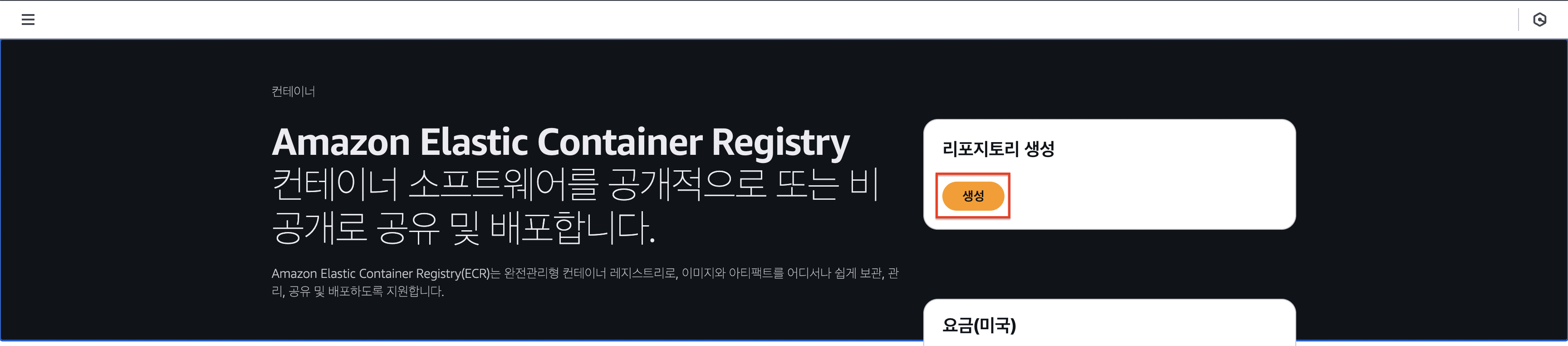 AWS ECR로 들어와서 리포지토리를 생성해준다.