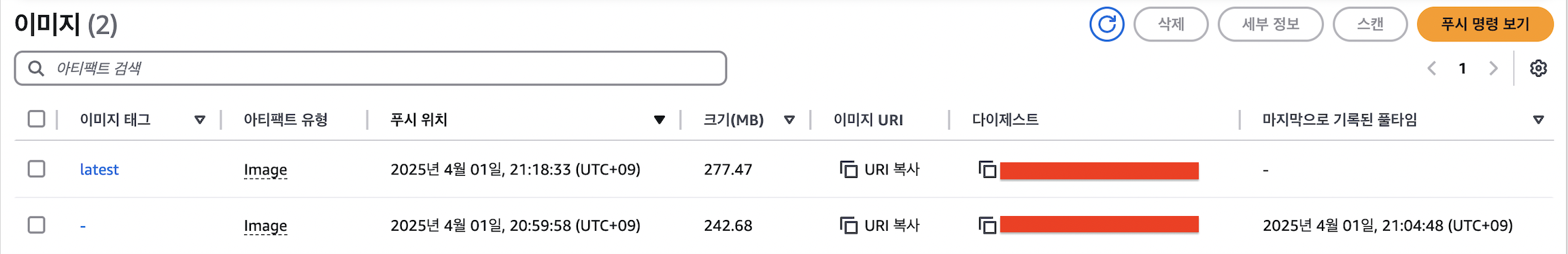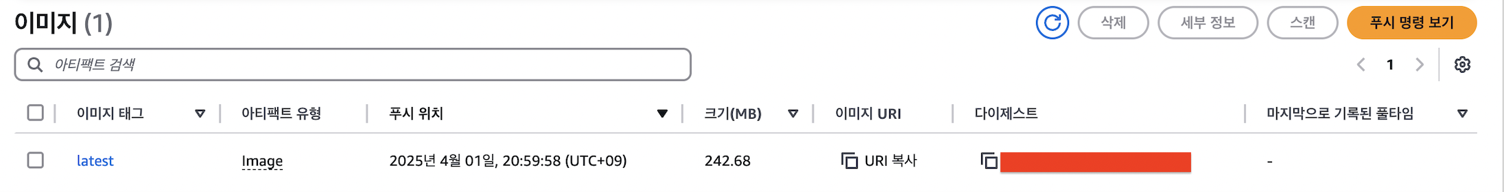 명령어를 다 입력하고 새로고침 해주면 이렇게 ECR에 이미지가 성공적으로 올라와있다.
