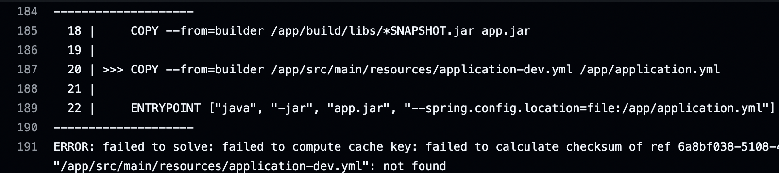 왜그러냐면 deploy.yml에서 echo "spring: ..." > src/main/resources/application-dev.yml 로 application-dev.yml 파일을 생성했지만 이걸 도커파일로 복사를 안해서 그런것