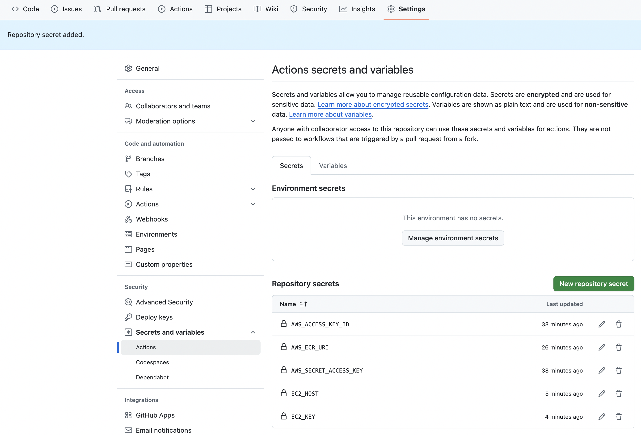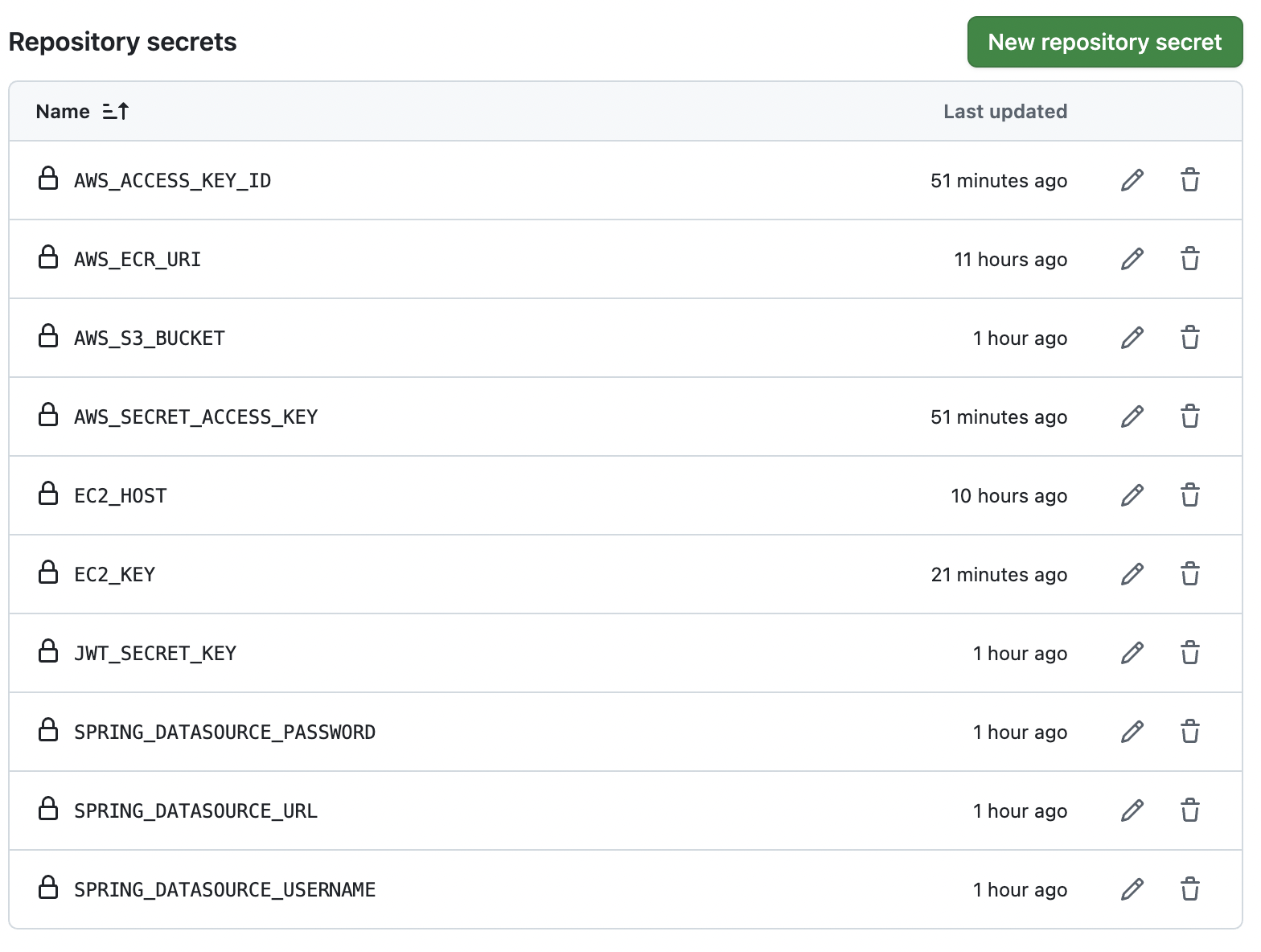 이렇게 deploy.yml 이 작성됐으면 중간에 환경변수들로 설정된 값들을 GitHub Secrets에 해준다.