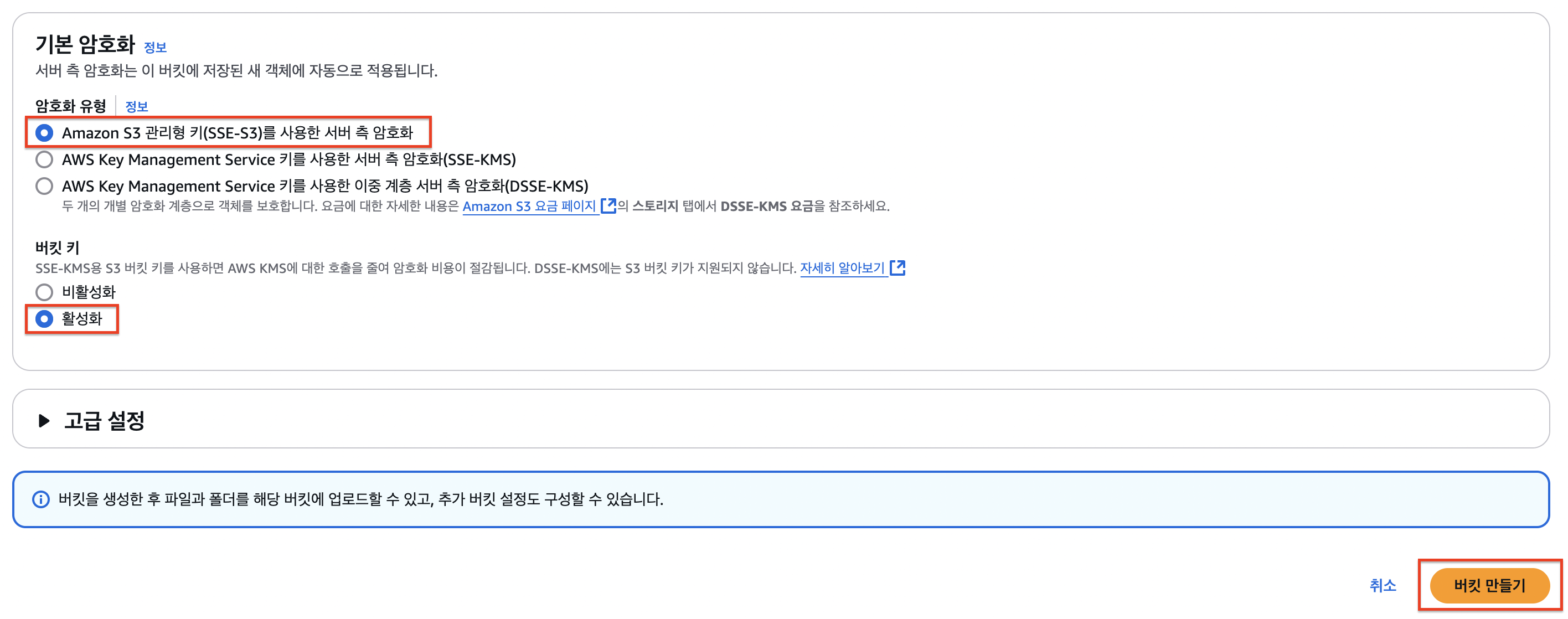 마지막으로 버킷 만들기를 선택하면 완료된다!