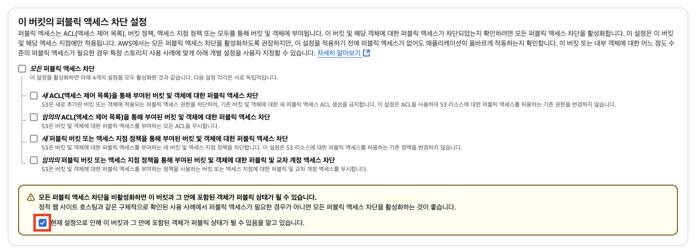 ② 새 ACL(액세스 제어 목록)을 통해 부여된 버킷 및 객체에 대한 퍼블릭 액세스 차단
