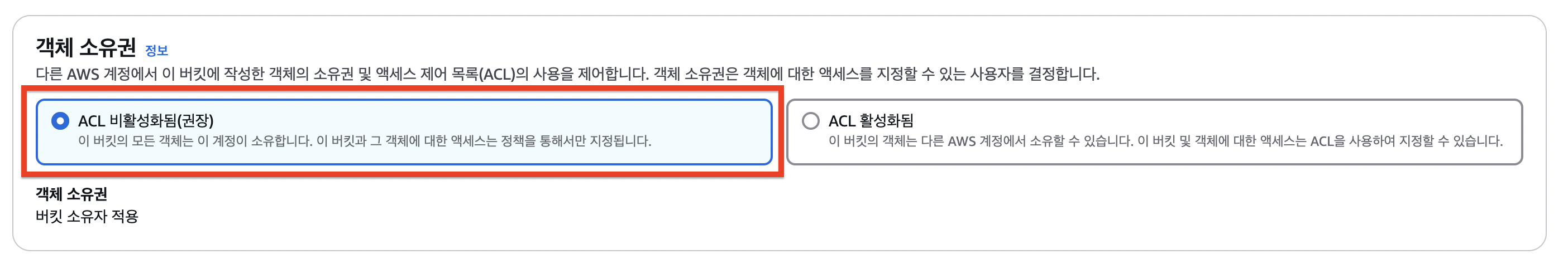 간단하게 말하자면 버킷에 올린 객체(파일)의 소유권을 버킷 소유자로 할지, 객체를 올린 사람으로 할지 정하는 것이다.